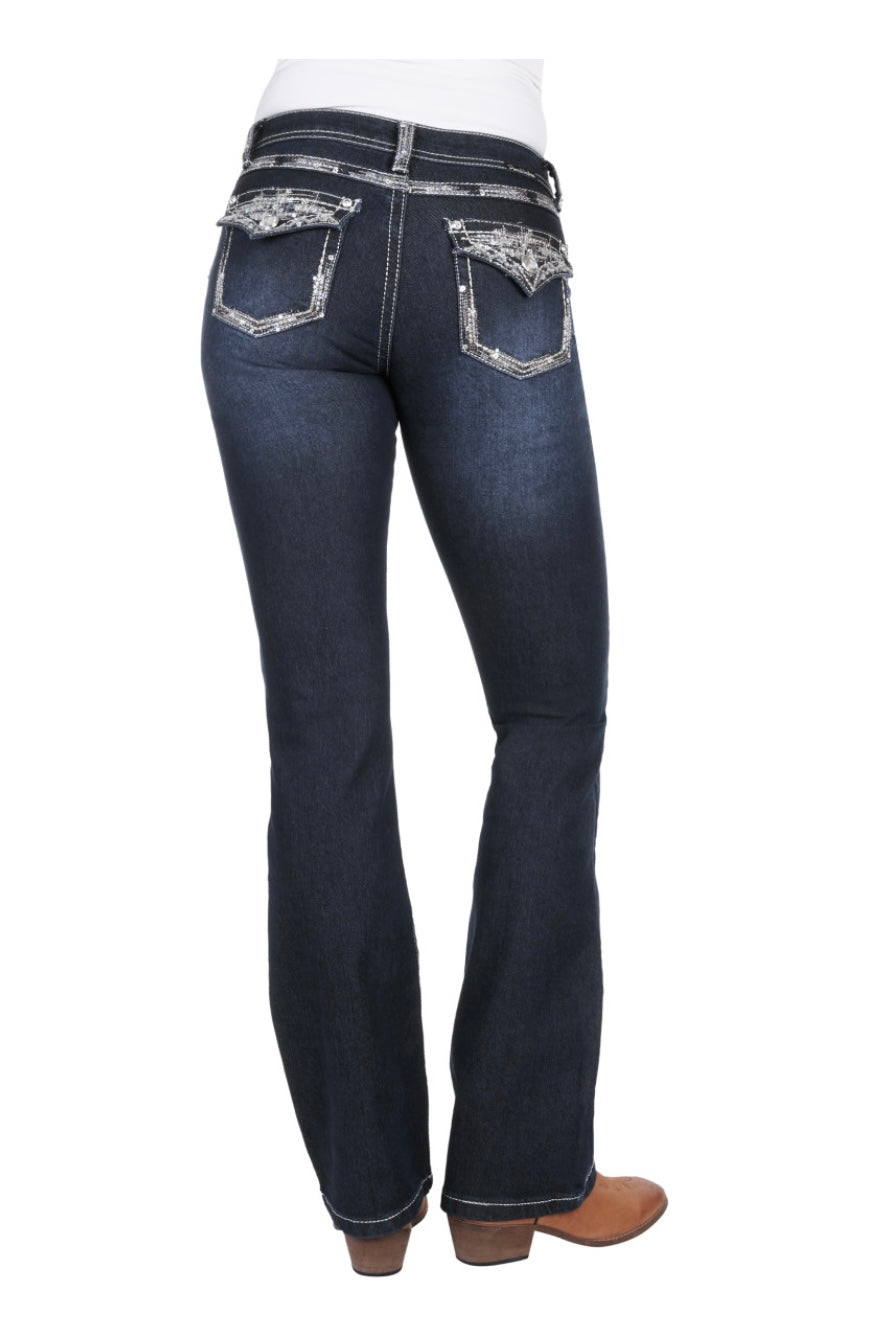 34 Inch leg - boot cut, stretch for comfort, mid rise, diamante shank button & rivets, feature embroidery on back pockets and front scoop pockets, contrast all over topstitch